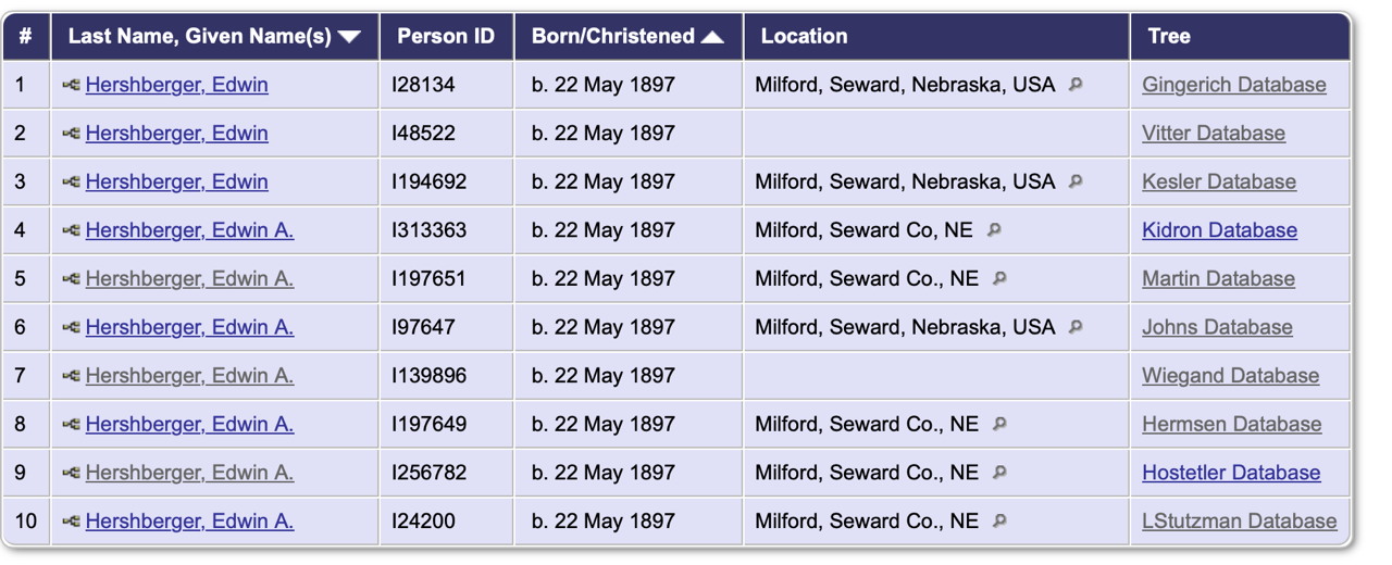Most databases in SAGA have Edward Hershberger’s (b. 1897) first name as Edwin which is incorrect as far as I can tell. I think this is because there is a genealogy book that has Edwin . . . and not Edward as it should be. Anyway, most databases followed suit with Edwin although Lint, Roth and mine did not.
