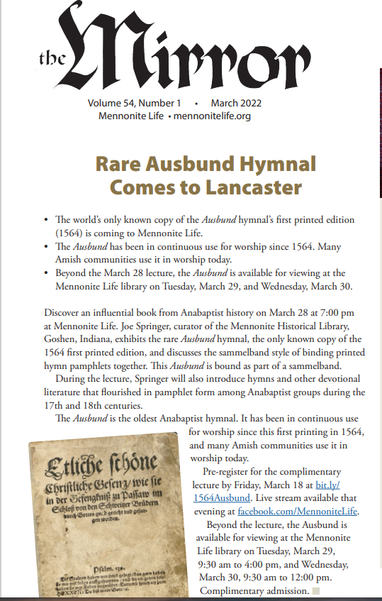 In the recent Mirror announces SAGA member Joe Springer's lecture (available via live Stream). We have enjoyed Joe's presentation during a previous annual meeting on his 2-volume Montbeliard Mennonite Church Register 1750-1958. Joe is curator at the Mennonite Historical Library in Goshen, IN.